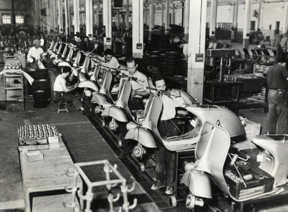 L’histoire commence à Gênes en 1884 lorsqu’à l’âge de vingt ans, Rinaldo Piaggio fonde l’entreprise qui porte son nom. Elle se développe rapidement et fabriquera des bateaux, des trains, des trams, des camions et même des avions, dont le quadrimoteur Piaggio P108 qui sera un succès tant dans l’aviation civile que militaire lors de la seconde guerre mondiale. Les usines seront bien évidemment bombardées par les alliés qui ne laisseront que des ruines.