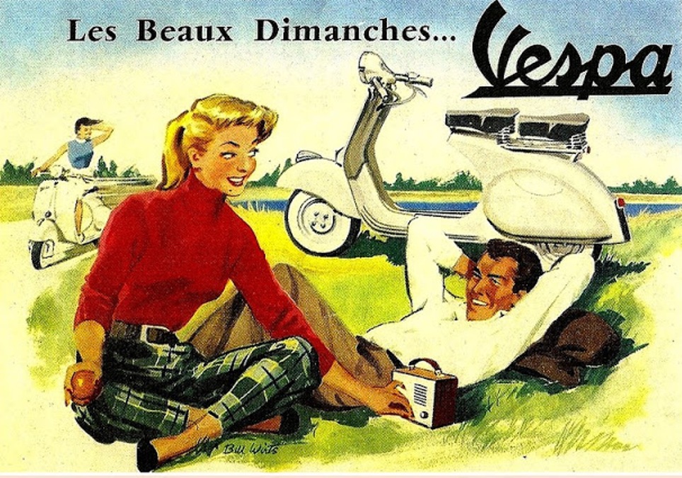 La Vespa étonne, le carnet de commande se remplit petit à petit, les prix de 55.000 lires pour la version normale et de 61.000 lires pour la « luxe », avec béquille, flancs blancs et compteur de vitesse étant plutôt attractifs. Piaggio crée lui-même des clubs Vespa et tire une énorme popularité de films tels que « Vacances Romaines » en 1953 et « La Dolce Vita » en 1960. Toutes les grandes vedettes ont roulé en Vespa et de jolies filles ne sont jamais bien loin. Une publicité magnifiquement orchestrée en fait le symbole de la jeunesse et de la liberté, une image inestimable qui lui vaut un succès phénoménal ! Du side-car au triporteur, les versions foisonnent et dès 1950, des usines se créent en Allemagne, en Grande-Bretagne, en France, en Espagne, en Belgique. La Vespa sera bientôt montée dans 13 pays, en Inde comme au Brésil et sera vendue dans 114 pays ! La Vespa passe le cap du million d’exemplaires en 1956 et dépasser maintenant les 16 millions. En Italie, plus de 3.350.000 exemplaires ont été vendus, soit une Vespa pour 5 habitants!